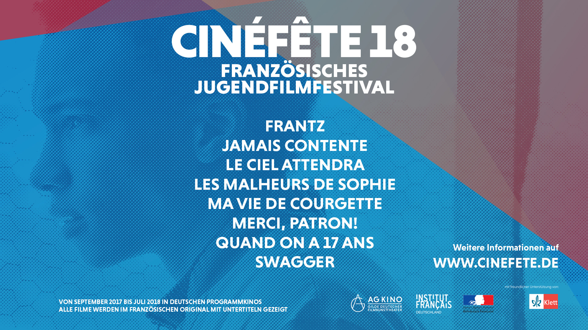 Im Jahr 2017/2018 tourt das französische Jugendfilmfestival Cinéfête wieder durch Deutschland. Dieses verlegt den Unterrichtsraum ins Kino und bietet die Möglichkeit, die französische Sprache und Kultur auf eine andere Weise zu entdecken. Vom 21. bis 27. Juni werden in der Kinemathek Karlsruhe acht französische Filme in Originalsprache mit deutschen Untertiteln zu verschiedenen Themen präsentiert.