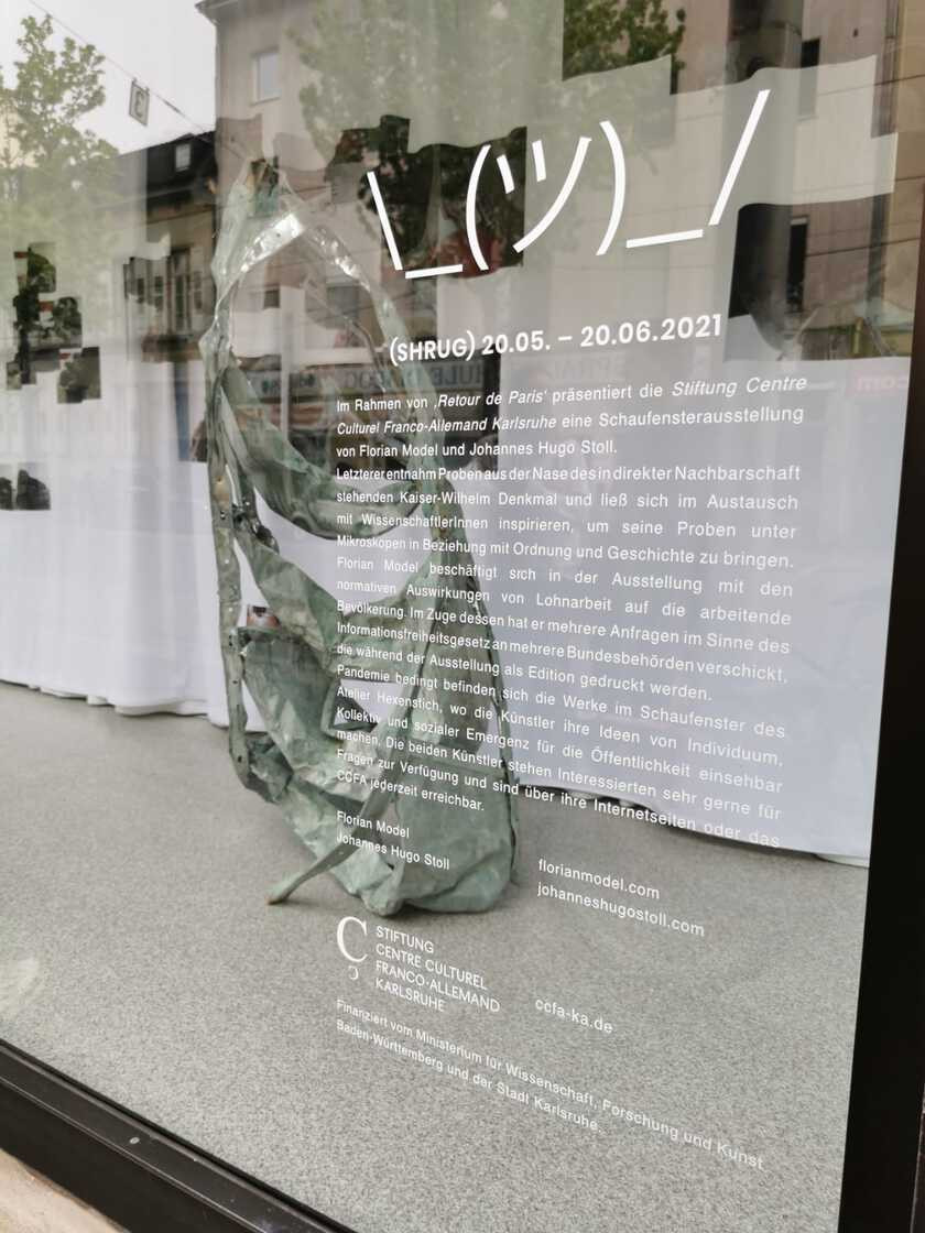 Im Rahmen der Reihe "Retour de Paris" 2021 präsentieren wir eine gemeinsame Ausstellung von Johannes Hugo Stoll und Florian Model. In einem Schaufenster im Stadtzentrum, Tag und Nacht einsehbar, stellt die gemeinsame Intervention der beiden Künstler Fragen zum Verhältnis von Individuum und Gesellschaft, von Innen und Außen – vor und hinter dem Schaufenster.