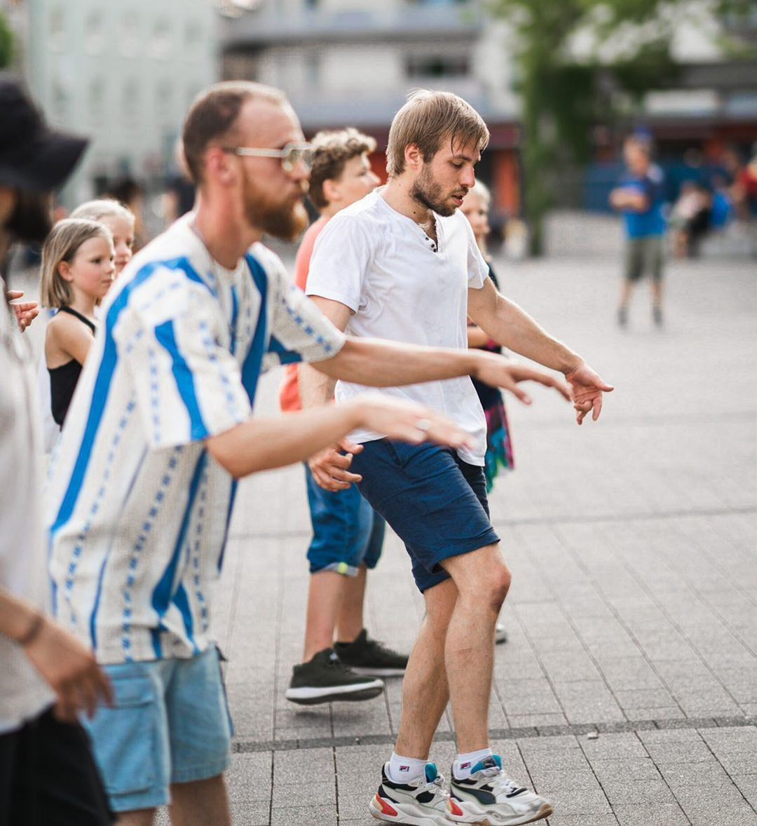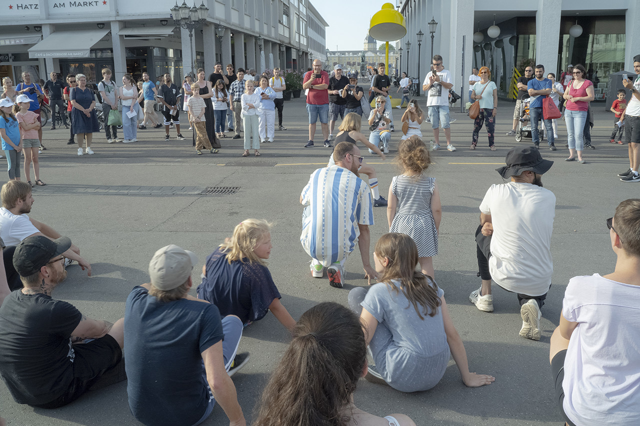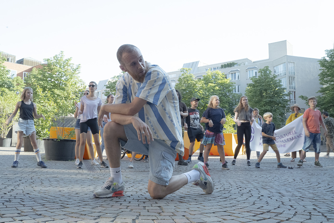 Dans le cadre d'un atelier de hip-hop avec le duo français Aurélien Salzard et Kévin Briot (Nancy), des habitants de Karlsruhe passionnés de danse élaborent une chorégraphie qui sera présentée le 21 juin à l'occasion de la traditionnelle Fête de la Musique sous la forme d'une parade sur la Kaiserstrasse désormais libérée du tramway.