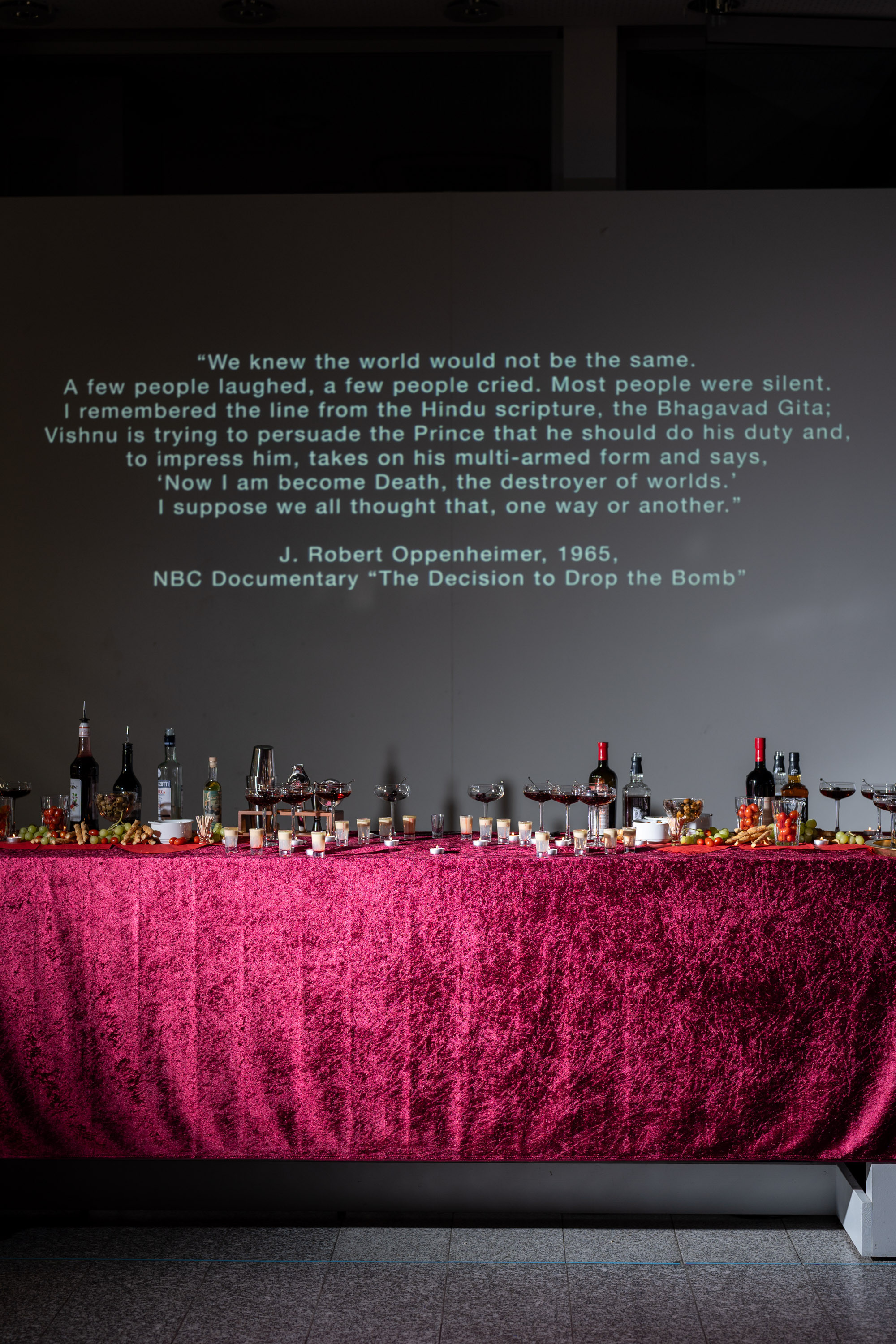 In ihrer Ausstellung befragt die Künstlerin Iden Sungyoung Kim imperialistische Geschichte und deren Wiederholung. Zwischen politischem Kalkül, wissenschaftlichem Experiment und humaner Katastrophe spannt sie einen historischen Bogen vom Manhattan-Projekt (Hiroshima) bis zum weltweiten Nuklearkonflit. Recherche in Archiven und der Zugriff auf Zeitzeuge lassen ein komplexes Narrativ von Konflikt, Risiko, imperialistischer Geste und dem blinden Glauben an wissenschaftlichen Fortschritt erstehen. Mit der Kernforschung bewegen wir uns auf fragilem, politischem Terrain. Am Eröffnungstag stellt eine Cocktail-Lecture Performance ironische Bezüge zur Alltagspolitik her.