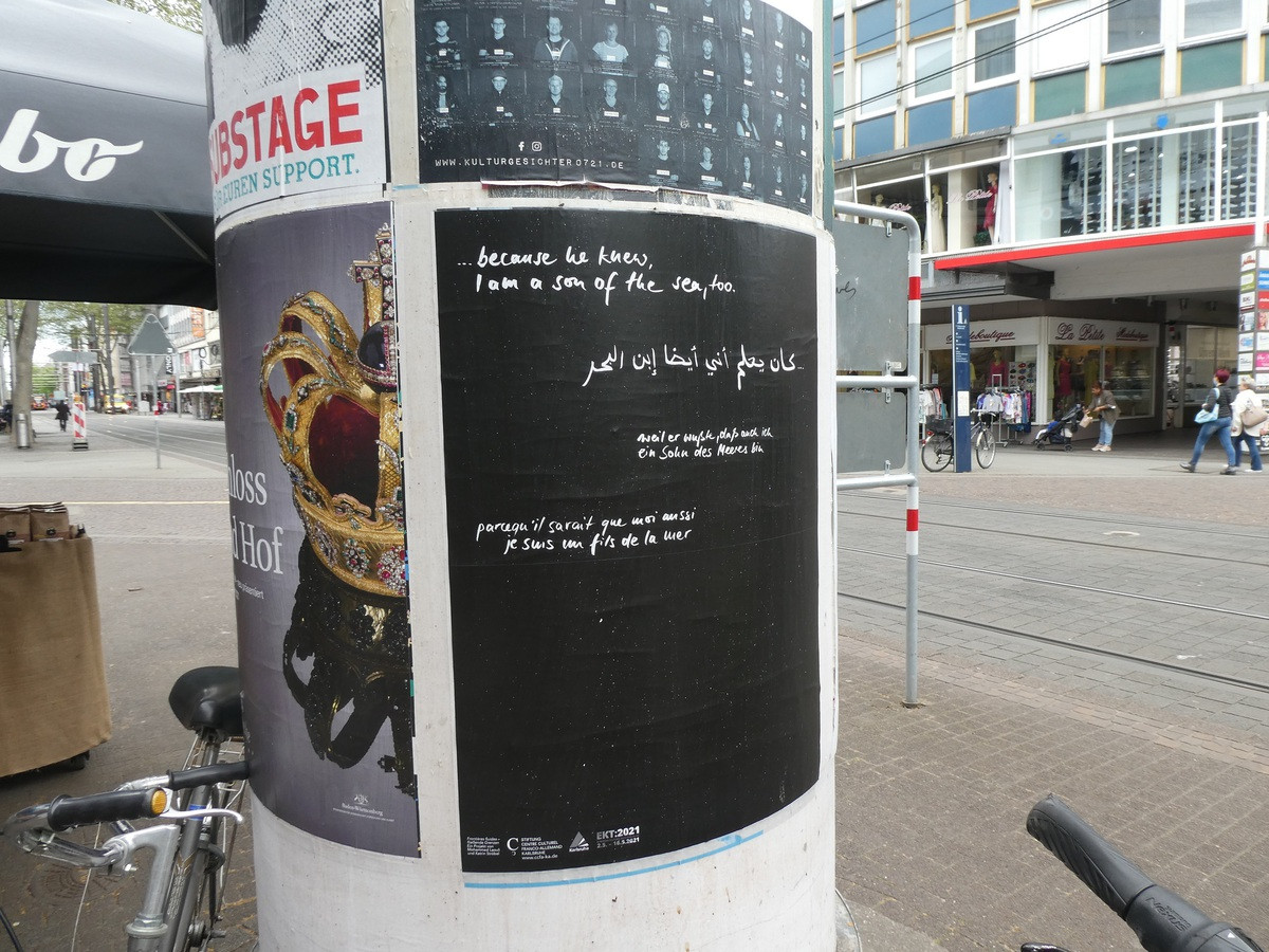 Au fil de leurs pérégrinations maritimes, le duo d‘artistes Katrin Ströbel (1975) et Mohammed Laouli (1972) a collecté les récits intimes de personnes en déplacement. Interprétés pour la première fois par les chanteurs Felicitas Brunke (soprano) et Florian Tavić (bariton) à l‘occasion des Journées Européennes de la Culture 2021, ces récits prennent la forme d'une installation sonore disponible à l‘écoute en ligne. Une campagne d’affichage dans l’espace public complète l’intervention.