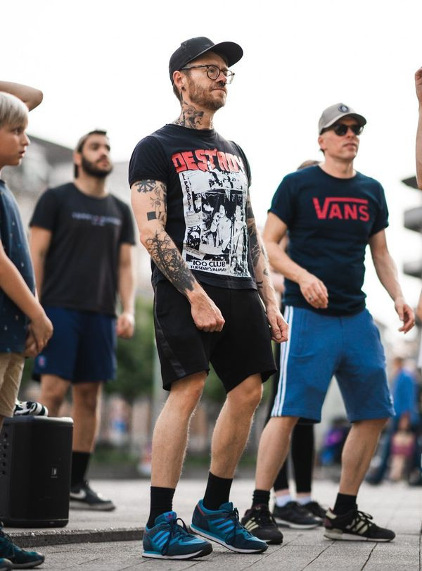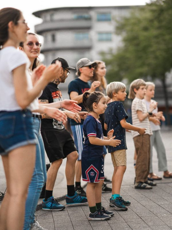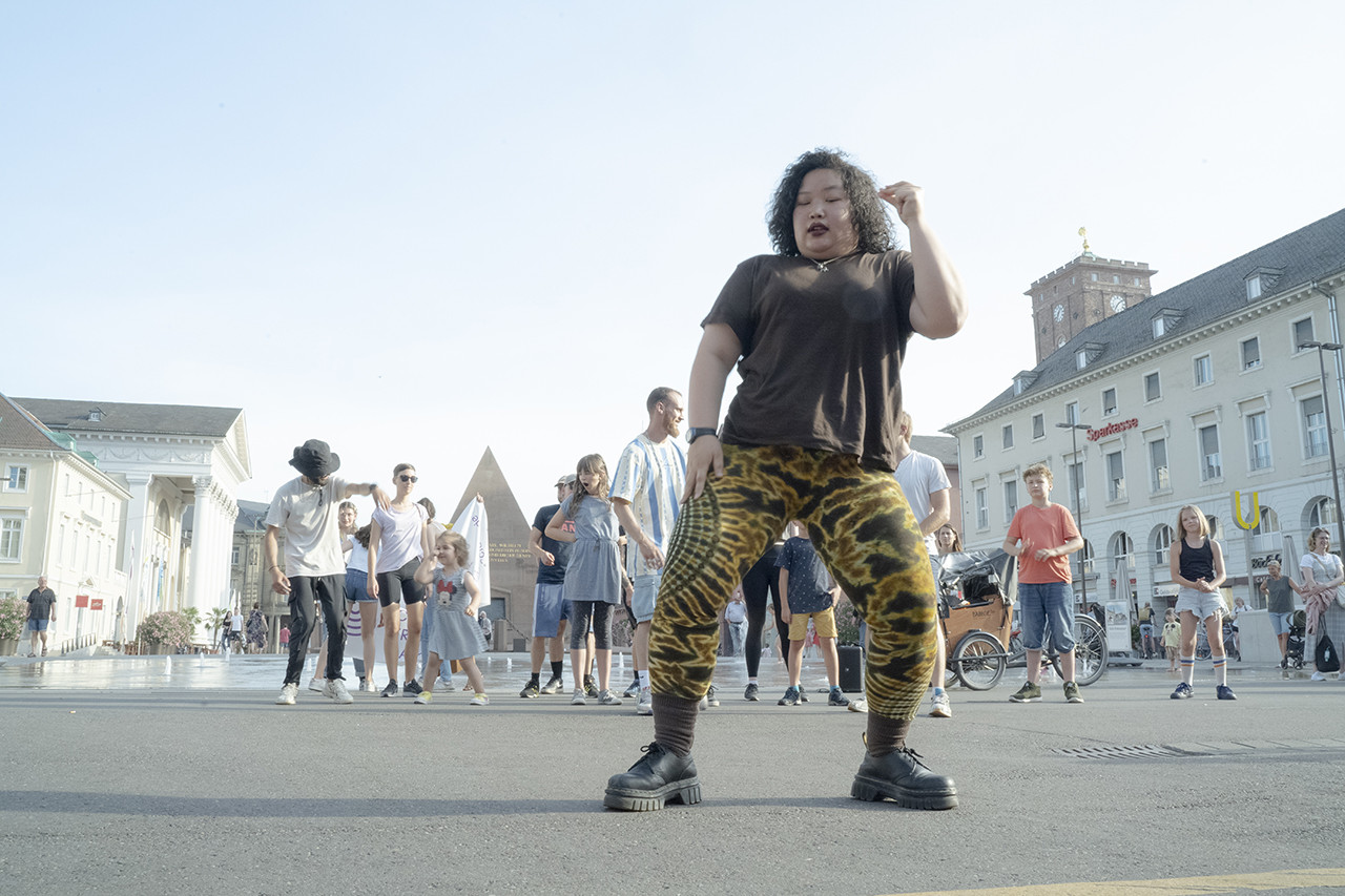 Dans le cadre d'un atelier de hip-hop avec le duo français Aurélien Salzard et Kévin Briot (Nancy), des habitants de Karlsruhe passionnés de danse élaborent une chorégraphie qui sera présentée le 21 juin à l'occasion de la traditionnelle Fête de la Musique sous la forme d'une parade sur la Kaiserstrasse désormais libérée du tramway.